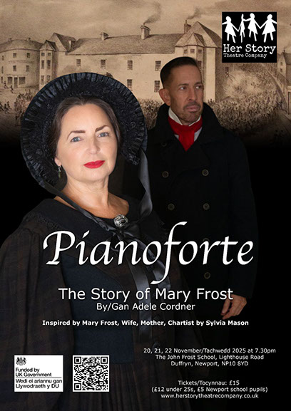Her Story Theatre Company is delighted to perform a few short scenes from their powerful new play, Pianoforte, the Story of Mary Frost by Adele Cordner. Adele is a Newport-born writer who was inspired to write the play by Sylvia Mason’s wonderful book, Mary Frost, Wife, Mother, Chartist, which Adele first read after attending Sylvia’s talk at last year’s Newport Rising Festival.