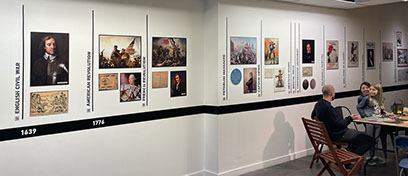 The wall at the rear of the HUB contains adverts from the Victorian period and the right wall contains contemporary radical posters from the Red Shoes Poster Archive.